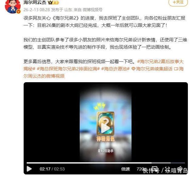 今年2月,周云杰在个人微博发布视频,探班《海尔兄弟续集》主创团队。主创团队透露《海尔兄弟续集》会有一个神秘角色。